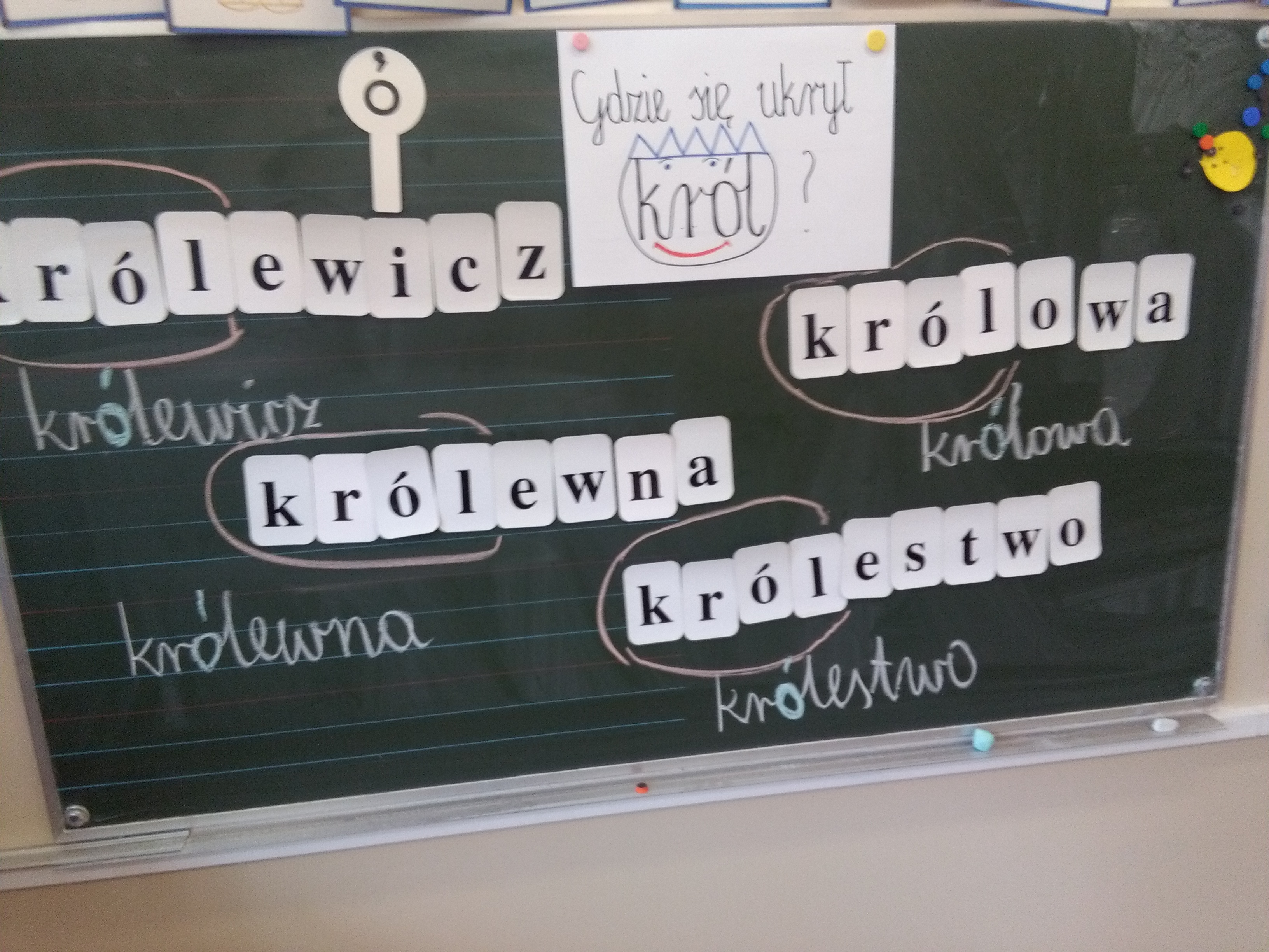 Uczniowie klasy 1a rozpoczynają przygodę z ortografią. Poszukują wyrazów do rodziny i tworzą ortograficzną wstęgę.