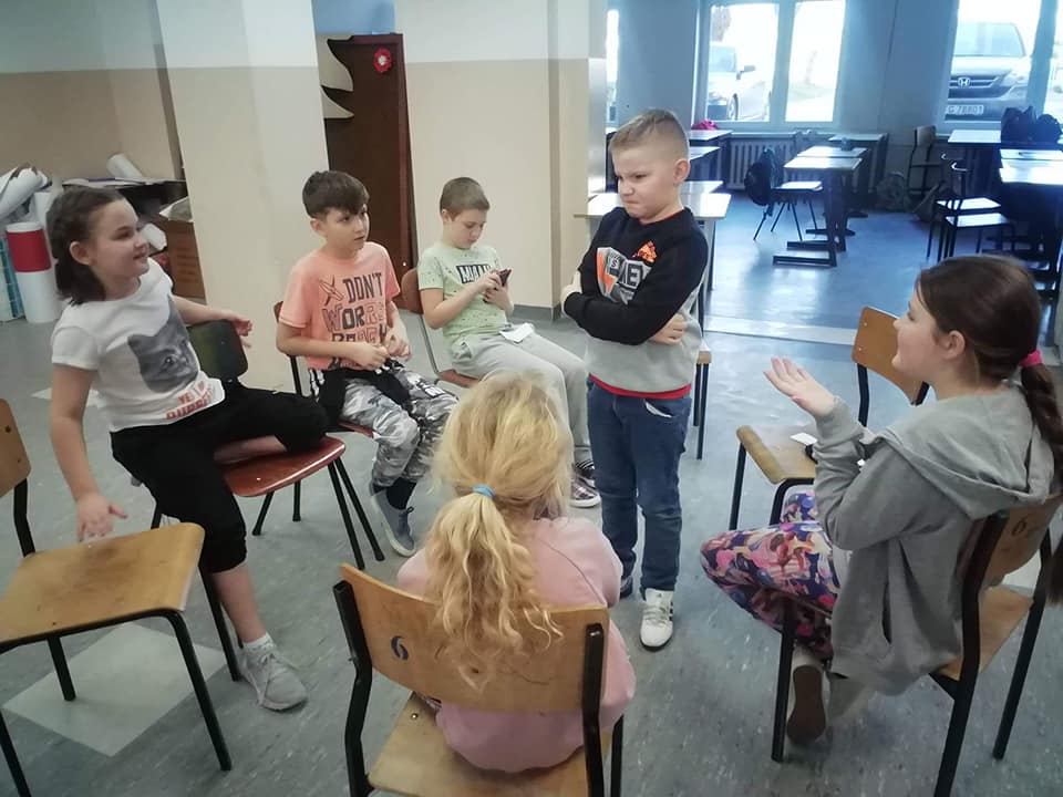 Lekcja etyki w klasie IV na temat: Reaguj, gdy komuś dzieje się krzywda. Na zdjęciu widoczny jest pierwszy etap zajęć, podczas którego uczniowie prezentują za pomocą mimiki i gestów emocje, których nazwy otrzymali na karteczkach od nauczyciela. Zadaniem pozostałych jest odgadnięcie jakie to emocje. W ten sposób powstał krąg uczuć jako podłoże empatii do dalszego przebiegu lekcji.