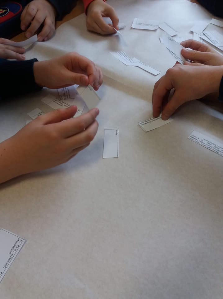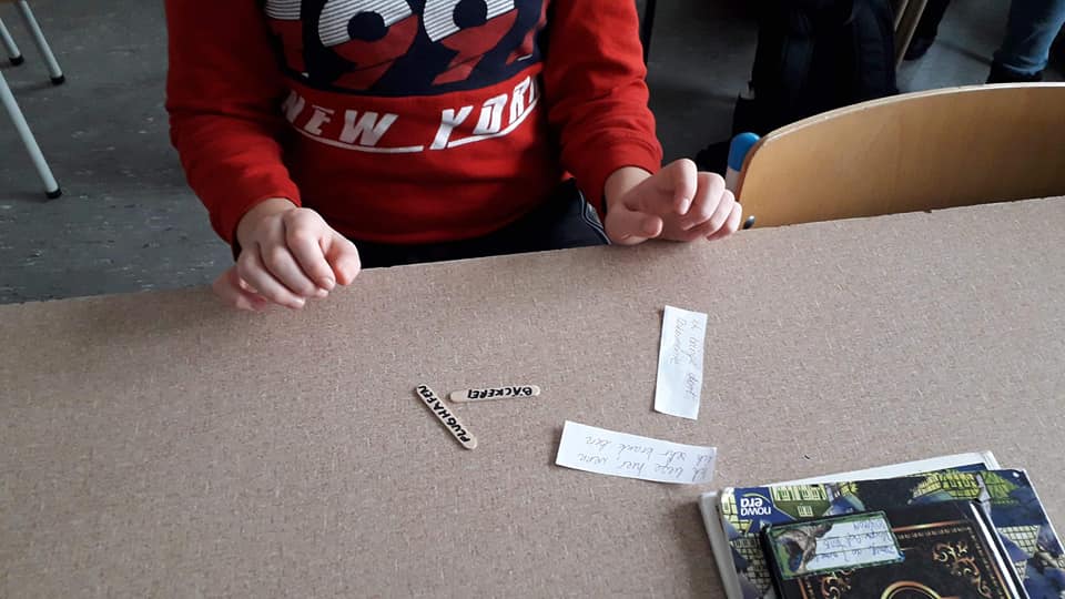 Lekcja etyki w 7 klasie na temat mowy nienawiści. Na zdjęciu uczniowie wykonują ćwiczenie, które jest przeciwwagą czyli dobrym słowem. Każdy uczestnik pisze każdemu innemu miłe, doceniające słowo i wkłada je do koperty z jego imieniem. Ma to na celu pokazanie, że nie tylko mowa nienawiści rośnie ale i pozytywne inicjatywy a obraźliwe komentarze można zastąpić czymś pozytywnym.